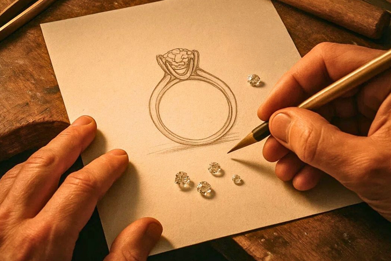 Every creation begins as a whisper of an idea, sketched with an architect’s eye and a poet’s heart. We don’t just design for beauty; we design for presence. Our artisans consider how light will dance off a facet at midnight, how a necklace will sit against the skin, and how a ring will feel as it becomes a part of your daily life.