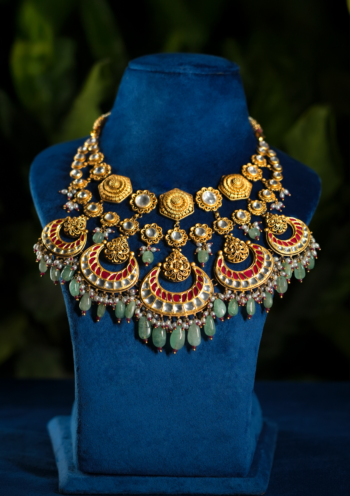 Featuring intricate Polki craftsmanship, this necklace combines uncut diamonds, pearls, and vibrant enamel for a regal, everlasting charm.